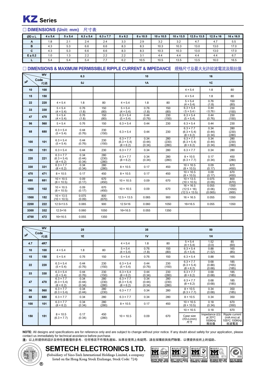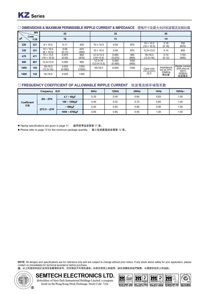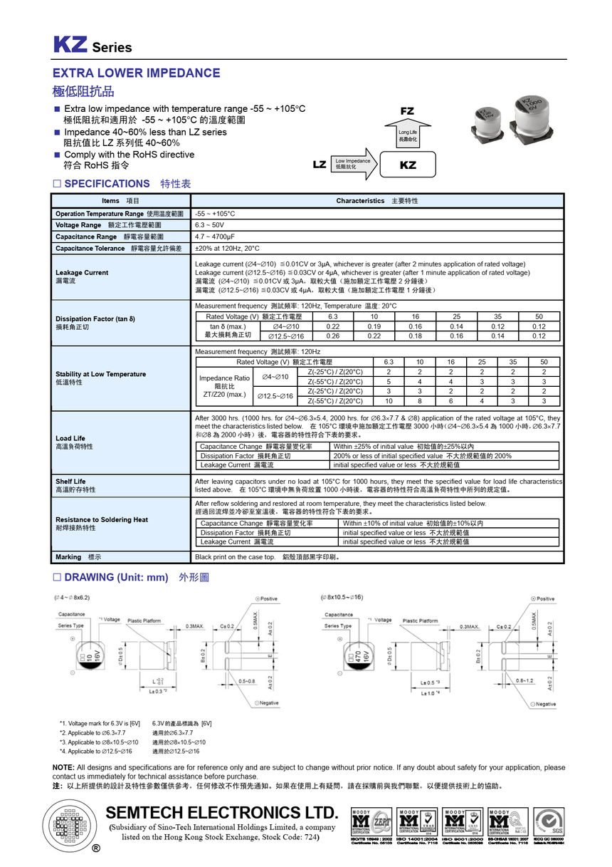KZ系列、 极低阻抗品、-55~+105℃、符合RoHS指令