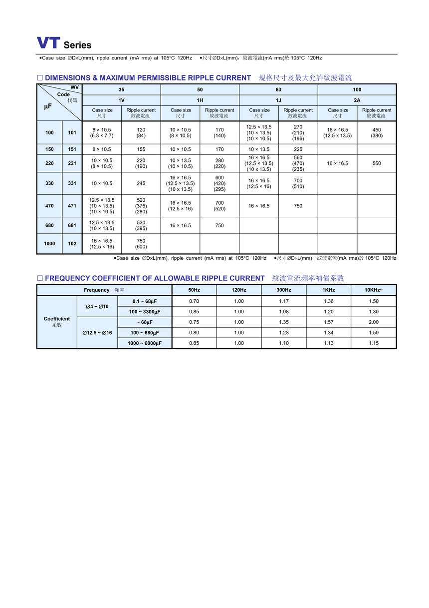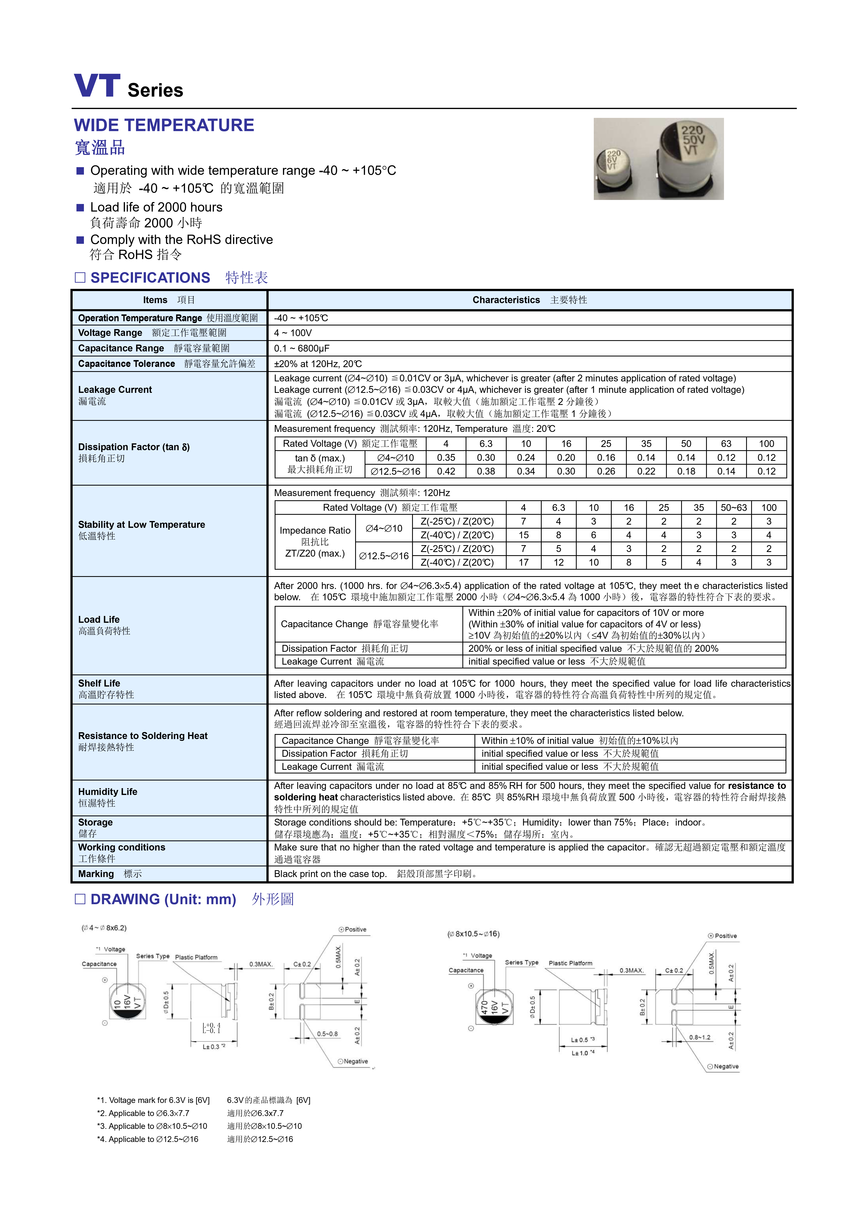 VT系列、宽温品、-40~+105℃、2000H、符合RoHS指令